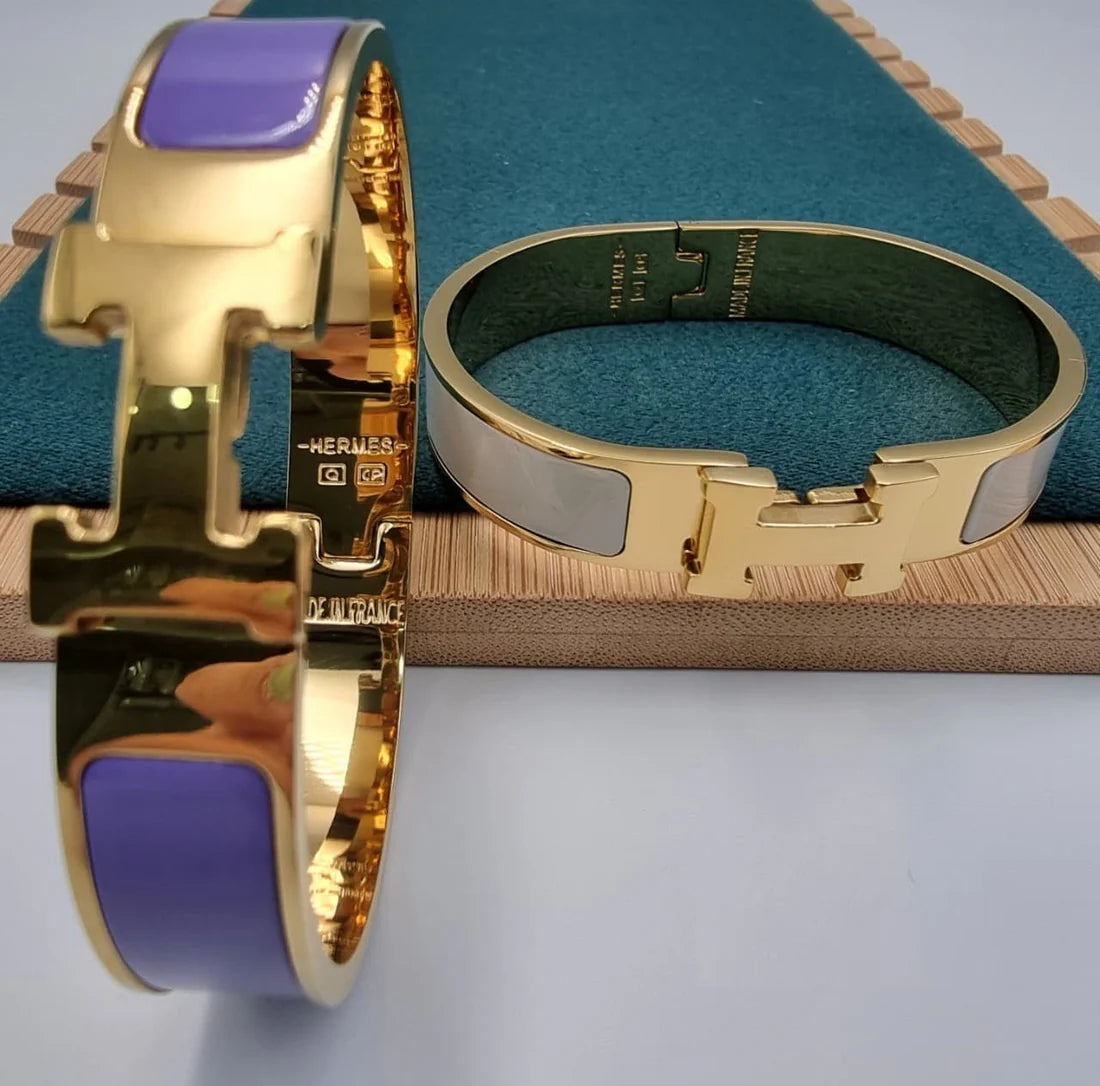 Luxury H Enamel Bracelet – A premium gold-plated hinged bangle with iconic “H” design and colorful enamel finish, blending elegance with modern fashion.